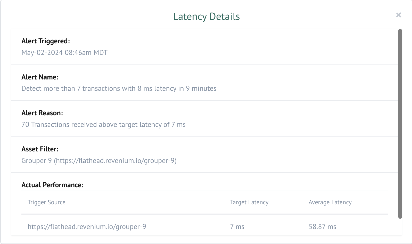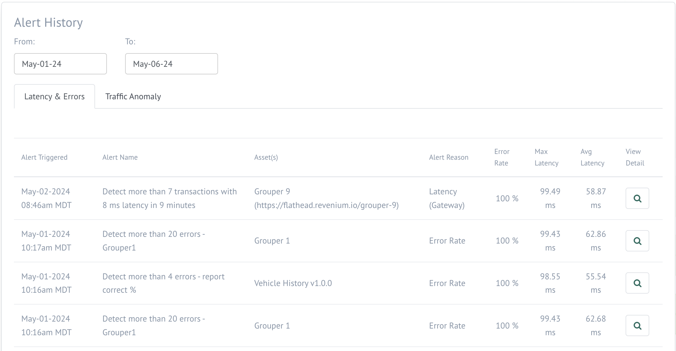 As alerts are generated, they will be logged on this page with the details that caused the alert to fire. you can find additional details for each alert on the "Latency & Errors" tab by clicking the magnifying glass icon. See Figure 2 for an example of the details provided after clicking the 'view detail' icon.