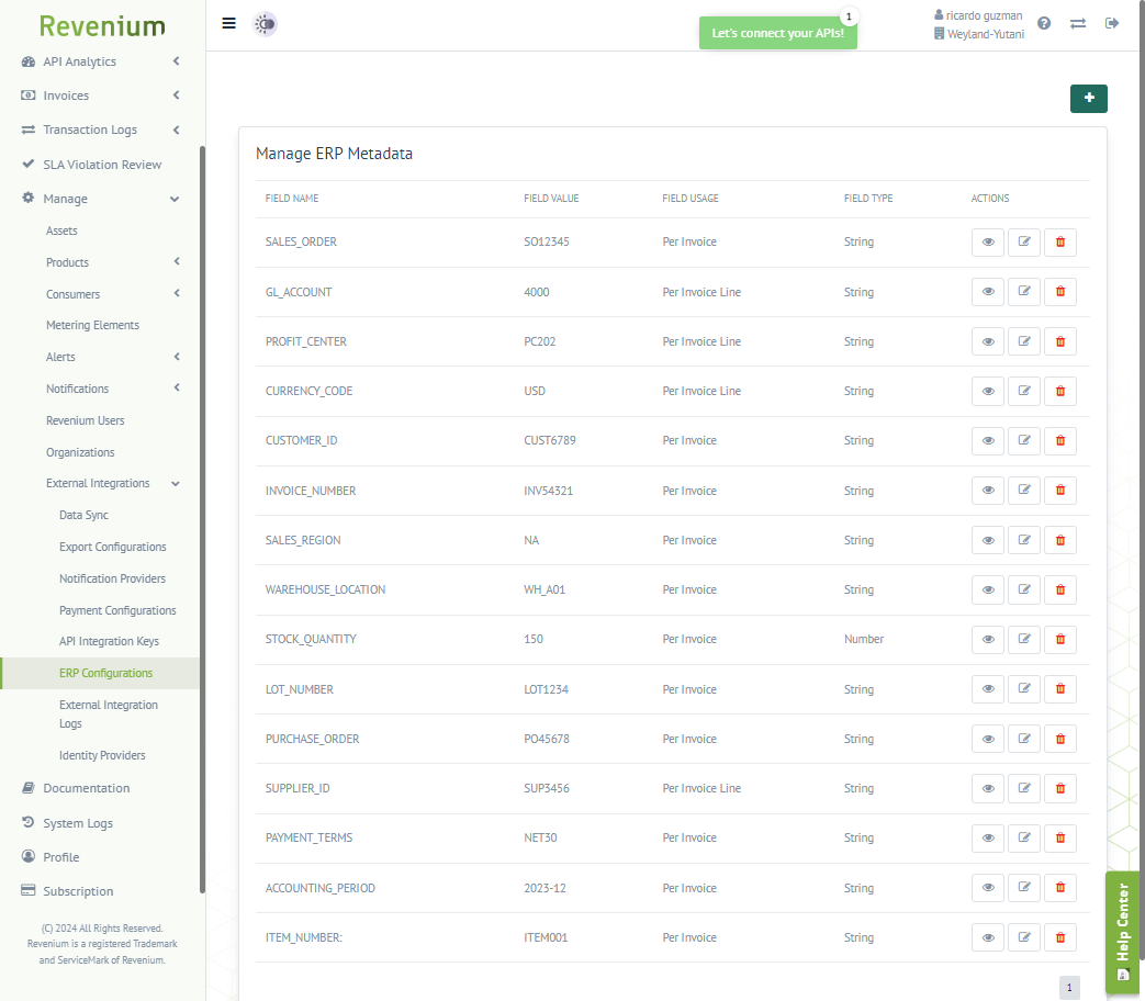 The ERP configurations page is used to customize and supplement the data that is exported from Revenium when interfacing with customers' ERP systems. This allows you to integrate Revenium's data into existing financial systems and related workflows.