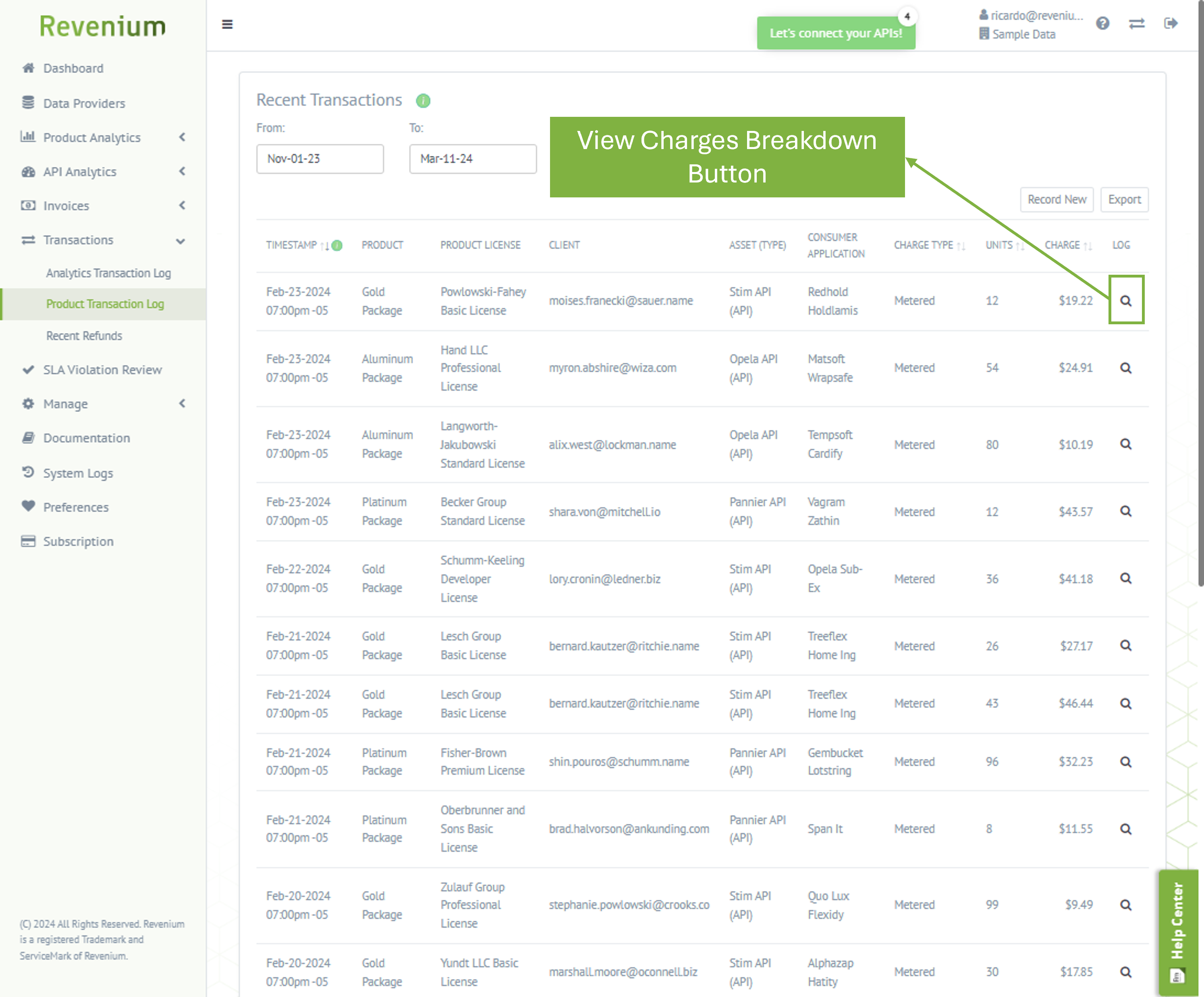 1. For line items that include additional details, an icon is shown in the log column. Click on the this icon button on any row with an available Line Item Charge Breakdown (Figure 2) to see the associated details.